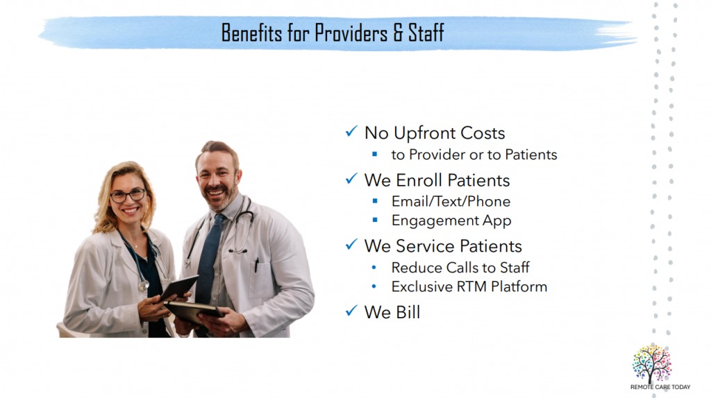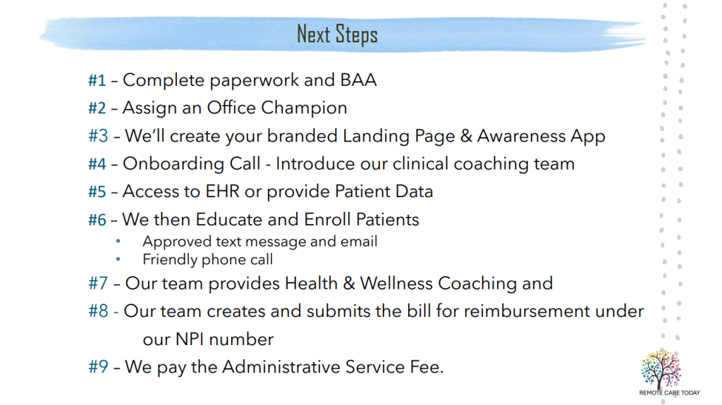 - 100 enrolled patients = $2,500/month or $30,000/year in profit
