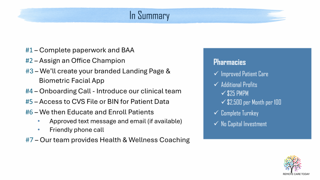 - 100 enrolled patients = $2,500/month or $30,000/year in profit